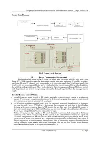 How to make Wireless Control 4 Channel at your Fingertips Circuit Diagram basic components of an RF remote control are buttons for the user to input a command, a microcontroller unit (MCU) to process the user commands into digital messages, an RF transmitter (RF TX) to modulate and transmit the message, an antenna, and a battery to provide power to the remote control. The common challenges manufacturers face in Point your IR remote control at the TSOP312 receiver module. Press any button on the remote control. You should see the relay click and its onboard LED will turn ON. Press the button again. The relay should click again, and the LED will turn OFF. Note that this circuit can be a bit sensitive to noise from other IR sources.
